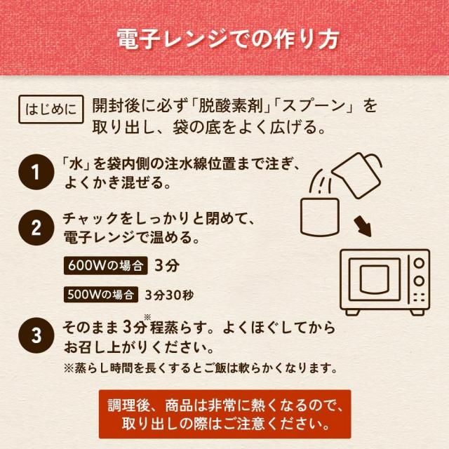 | 【注意事項】 ・熱湯の使用や電子レンジによる調理の際は「やけど」にご注意ください。 ・袋内に「脱酸素剤」「スプーン」及び「調味粉末袋」を入れたまま電子レンジ調理した場合、電子レンジの故障につながることもありますのでご注意ください。 ・オーブン、湯せん等、電子レンジ以外での加熱はおやめください。 ・加水して袋を横にすると中身がこぼれる恐れがあります。 ・1000W以上の電子レンジでは過加熱となりますのでおやめください。 ・脱酸素剤は食べられませんので取り除いてください。 ・開封後はお早めにお召し上がりください。 ・ゴミに出すときは、各自治体の区分に従ってください。 |