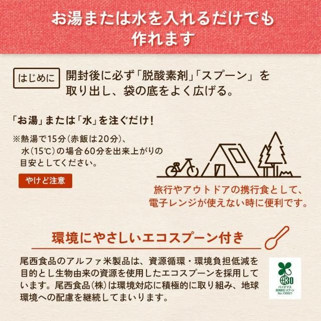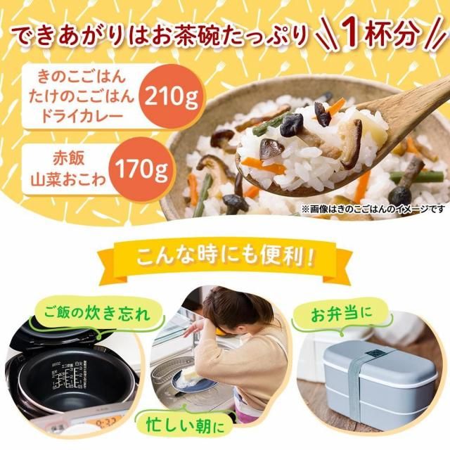 | 原材料 | 【ドライカレー】うるち米(国産)、味付乾燥具材(さやいんげん、味付玉ねぎ、コーン、人参)、調味粉末(食塩、砂糖、カレーパウダー、オニオンパウダー、コーンスターチ、たん白加水分解物、ターメリックパウダー、ガーリックパウダー、クミンパウダー、コリアンダーシードパウダー、食用植物油脂、パセリ)/調味料(アミノ酸等)、微粒酸化ケイ素、リン酸カルシウム、香料、トレハロース、酸化防止剤(ビタミンE) 【赤飯】赤飯(もち米(国産)、小豆、小豆煮汁)、顆粒食塩(食塩、寒梅粉) 【きのこごはん】うるち米(国産)、味付乾燥具材(食塩、食用植物油脂、ぶなしめじ、乾燥人参、たけのこ、砂糖、乾燥椎茸、なめこ、乾燥きくらげ、水煮わらび、かつお節エキス)/ソルビトール、調味料(アミノ酸)、酸化防止剤(ビタミンE) 【たけのこごはん】うるち米(国産)、味付乾燥具材(水煮たけのこ、ぶなしめじ、ぶどう糖、でん粉分解物、食塩)、調味粉末(食塩、かつお節エキス粉末、かつお節粉末、ぶどう糖加工品、砂糖、でん粉)/調味料(アミノ酸等)、トレハロース、酸化防止剤(ビタミンE)、香料 【山菜おこわ】もち米(国産)、うるち米(国産)、調味粉末(食塩、かつお節エキス粉末、ぶどう糖、ぶどう糖加工品、でん粉)、味付乾燥具材(水煮わらび、水煮ぜんまい、水煮えのき、水煮細竹、水煮ふき、醤油風調味料、かつお節エキス、砂糖、食塩、乾燥きくらげ)/調味料(アミノ酸等)、香料、ソルビトール、酸味料 |